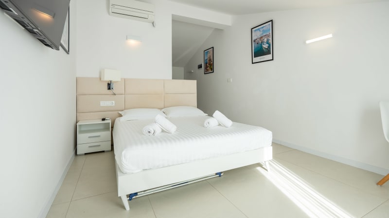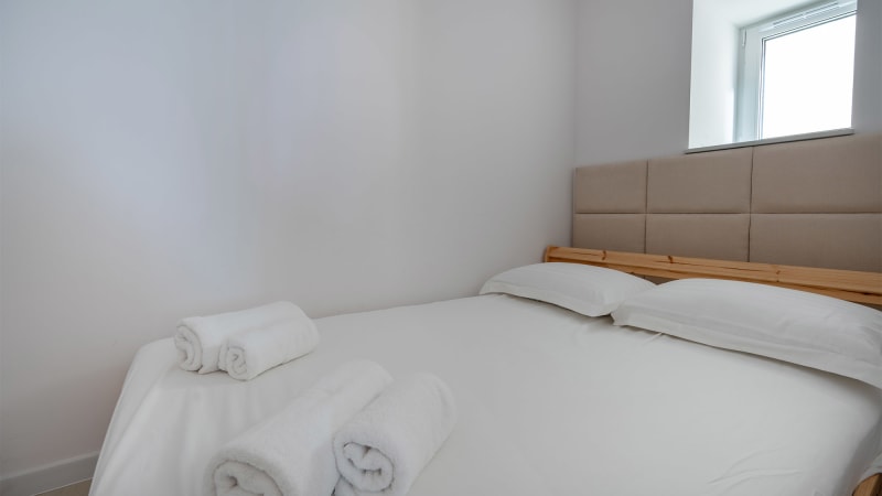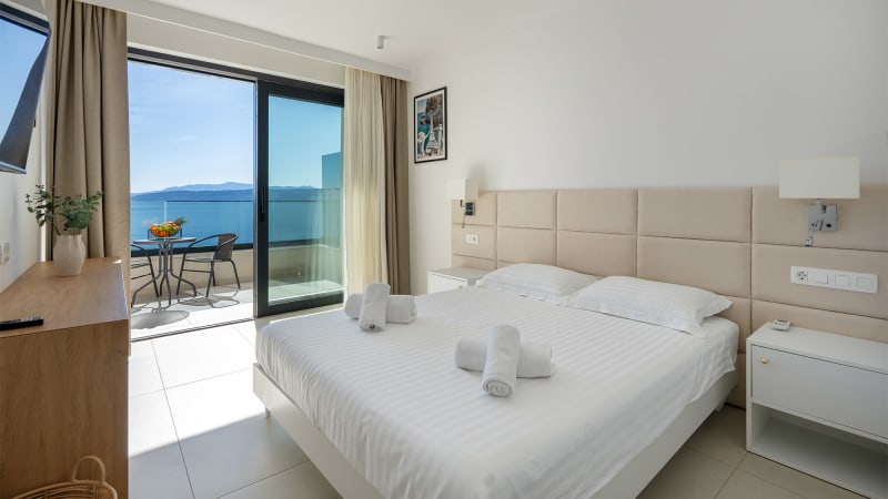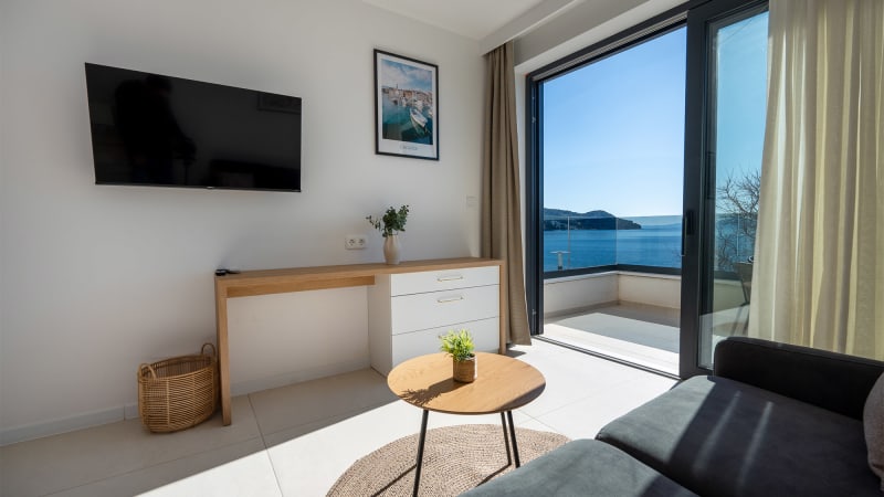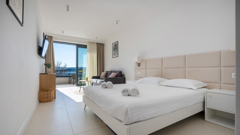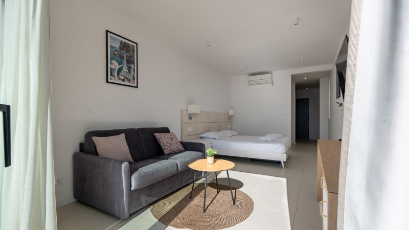 Denna moderna enrumslägenhet erbjuder ett bekvämt boende för 2–3 personer med vacker havsutsikt. Lägenheten är utrustad med en stor dubbelsäng samt en soffa som kan användas som extra bädd för en person.