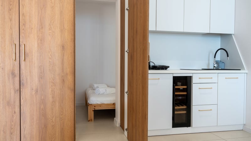 Denna enrumslägenhet för två personer erbjuder ett bekvämt och modernt boende. Här finns en dubbelsäng, ett rymligt kök samt ett stilrent badrum.