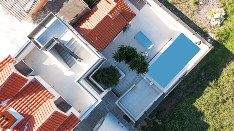 Bakom huset finns en gemensam uteplats i flera nivåer med pool, grillplats och solstolar – en perfekt plats för avkoppling och sociala stunder. Utemiljön håller på att färdigställas och kommer att erbjuda en trivsam miljö för gästerna att njuta av under sommaren.